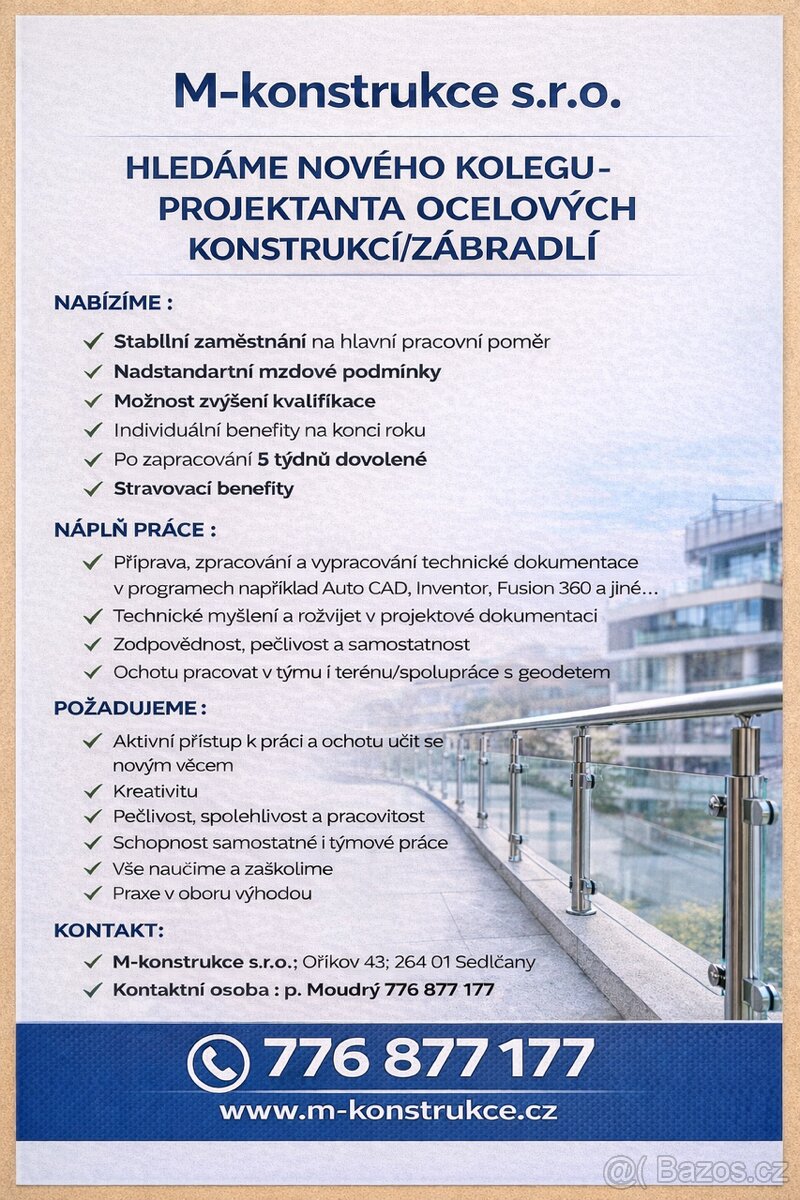 HLEDÁME NOVÉHO KOLEGU-PROJEKTANTA OCELOVÝCH KONSTRUKCÍ/ZÁBRADLÍ