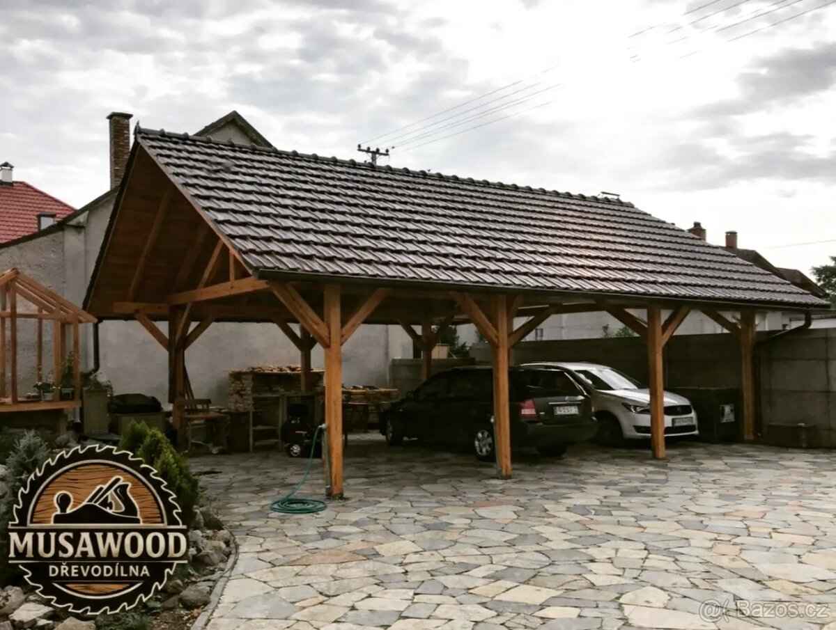 Pergoly, přístřešky, zahradní domky, dřevěné terasy, krovy i střechy. Zajišťujeme kompletní realizace včetně střešních krytin ve spolupráci s pokrývačem.