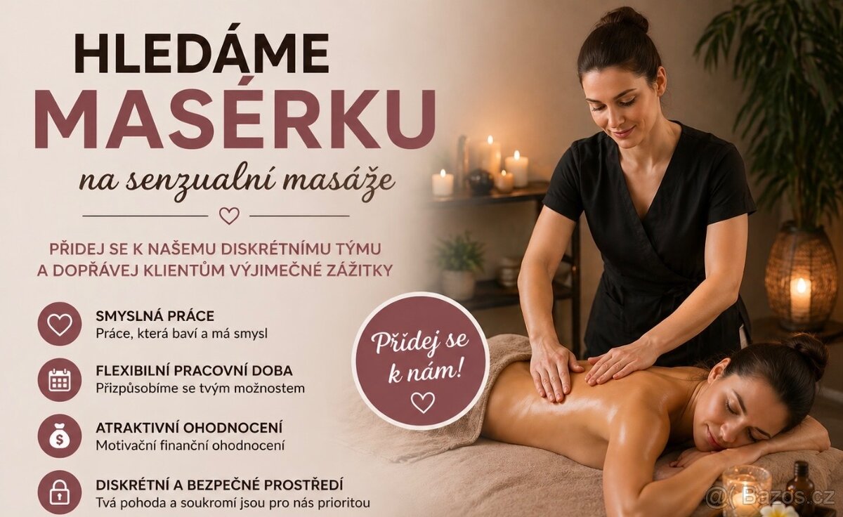 Tantra masáž - [14.4. 2026]Hledá se sympatická masérka. V případě zájmu se domluvíme. :-) Čisté krásné prostory a férový přístup je samozřejmostí. Prosím holky nekuřačky. První kontakt je lepší přes SMS, či whats up. Výdělek až 80 000,- podle šikovnosti a flexibility.. nejsem ...